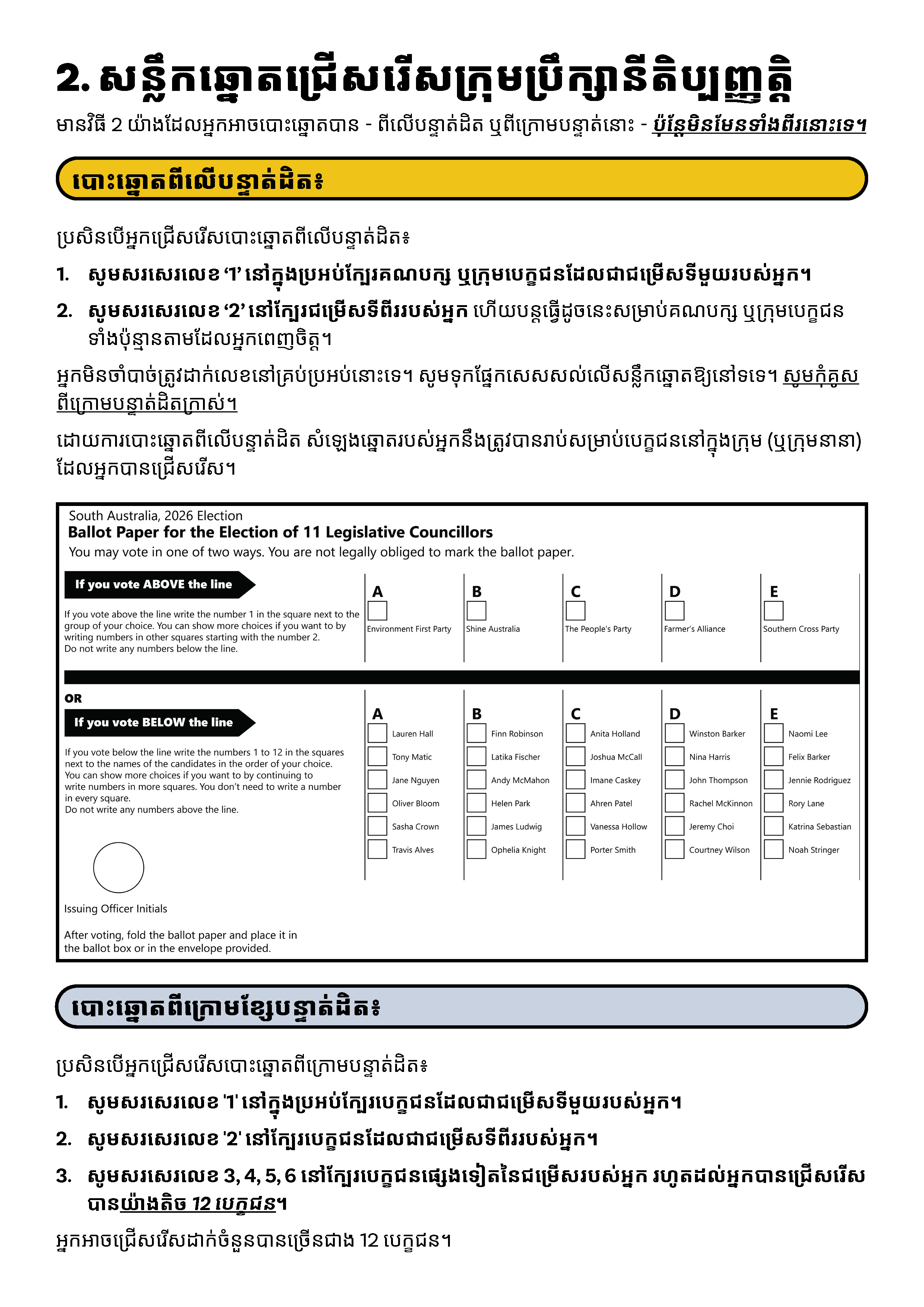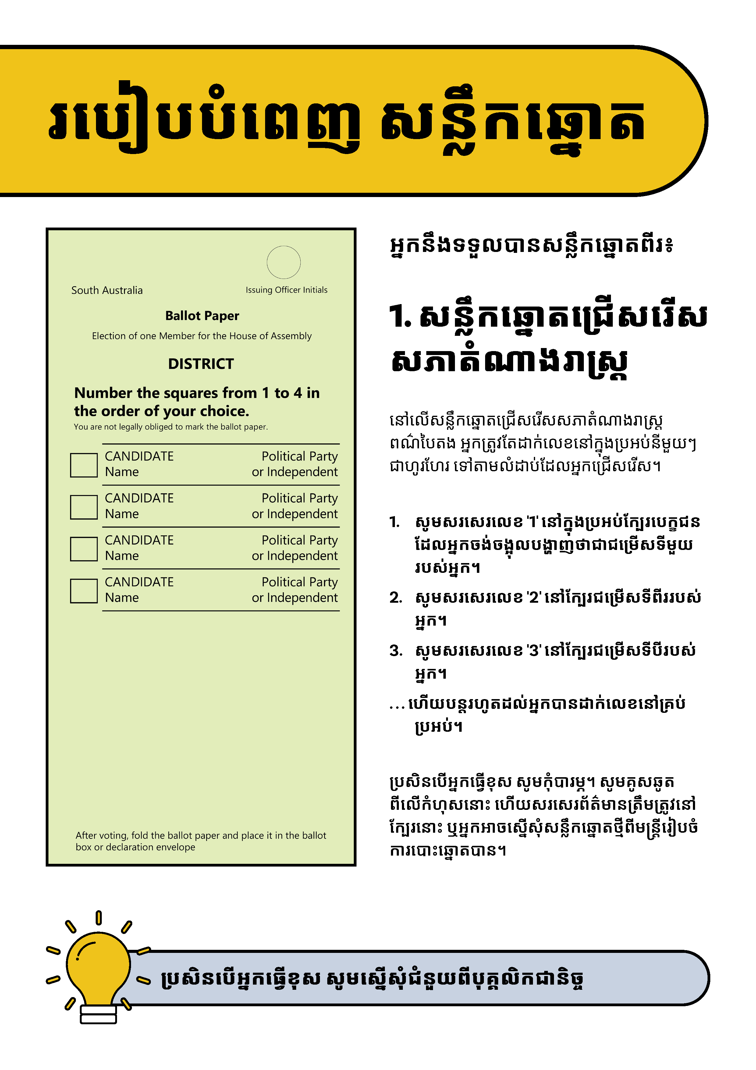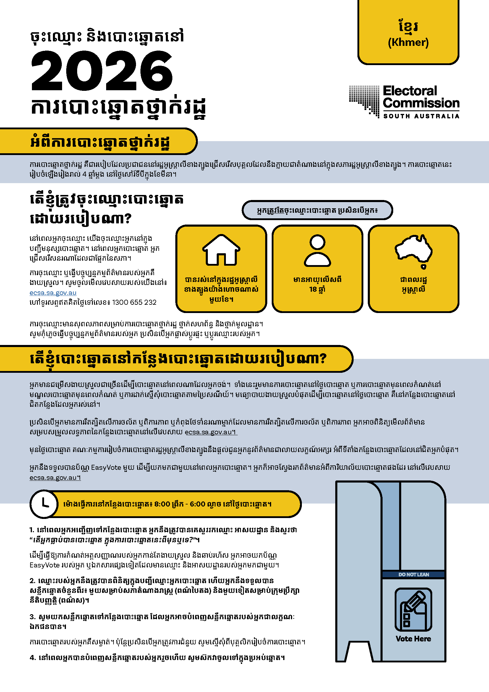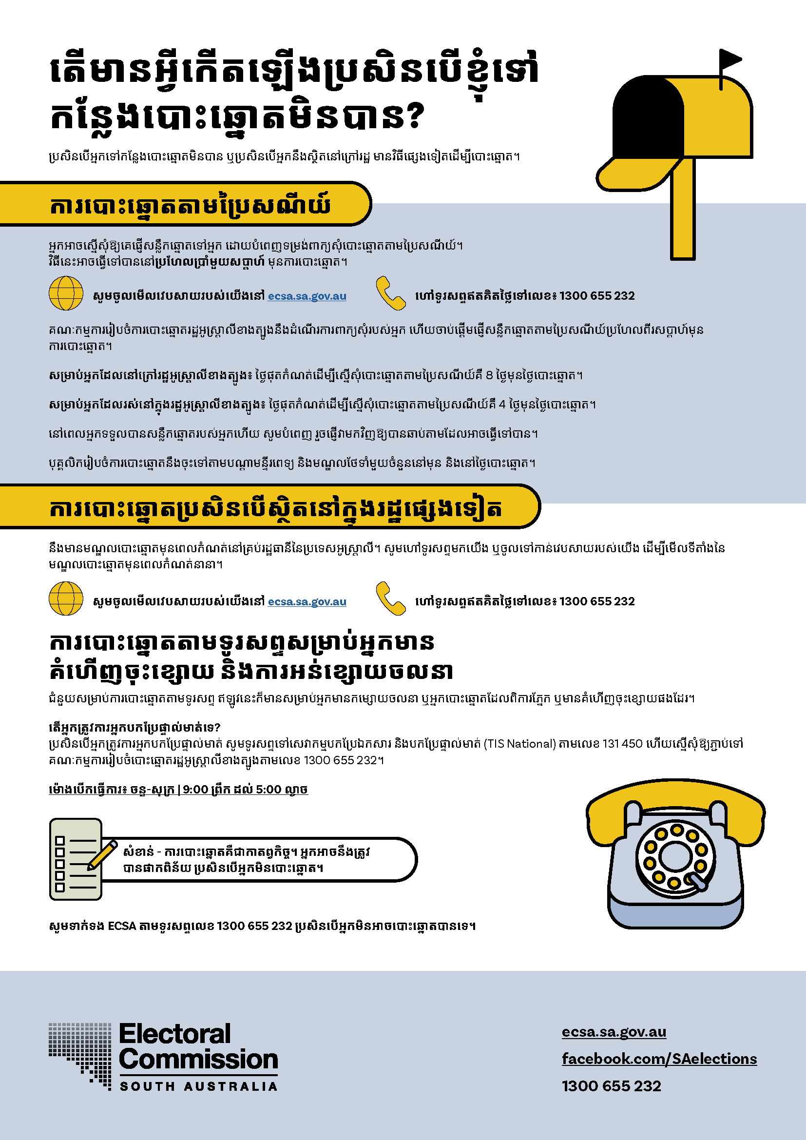 ប្រសិនបើលោកអ្នកត្រូវការអ្នកបកប្រែភាសា សូមទូរស័ព្ទសេវាបកប្រែភាសាសរសេរ និងនិយាយ (TIS National) លេខ 13 14 50  រួចស្នើសុំឱ្យគេទូរស័ព្ទទៅ គណៈកម្មការរៀបចំការបោះឆ្នោតរដ្ឋអូស្រ្តាលីខាងត្បូង (Electoral Commission SA) លេខ 1300 655 232។ ពេលម៉ោងធ្វើការរបស់យើងគឺចាប់ពីម៉ោង៩ព្រឹក ទៅម៉ោង៥ល្ងាច (ម៉ោងក្នុងតំបន់អូស្រ្តាលីកណ្តាល) ថ្ងៃច័ន្ទ ទៅថ្ងៃសុក្រ។