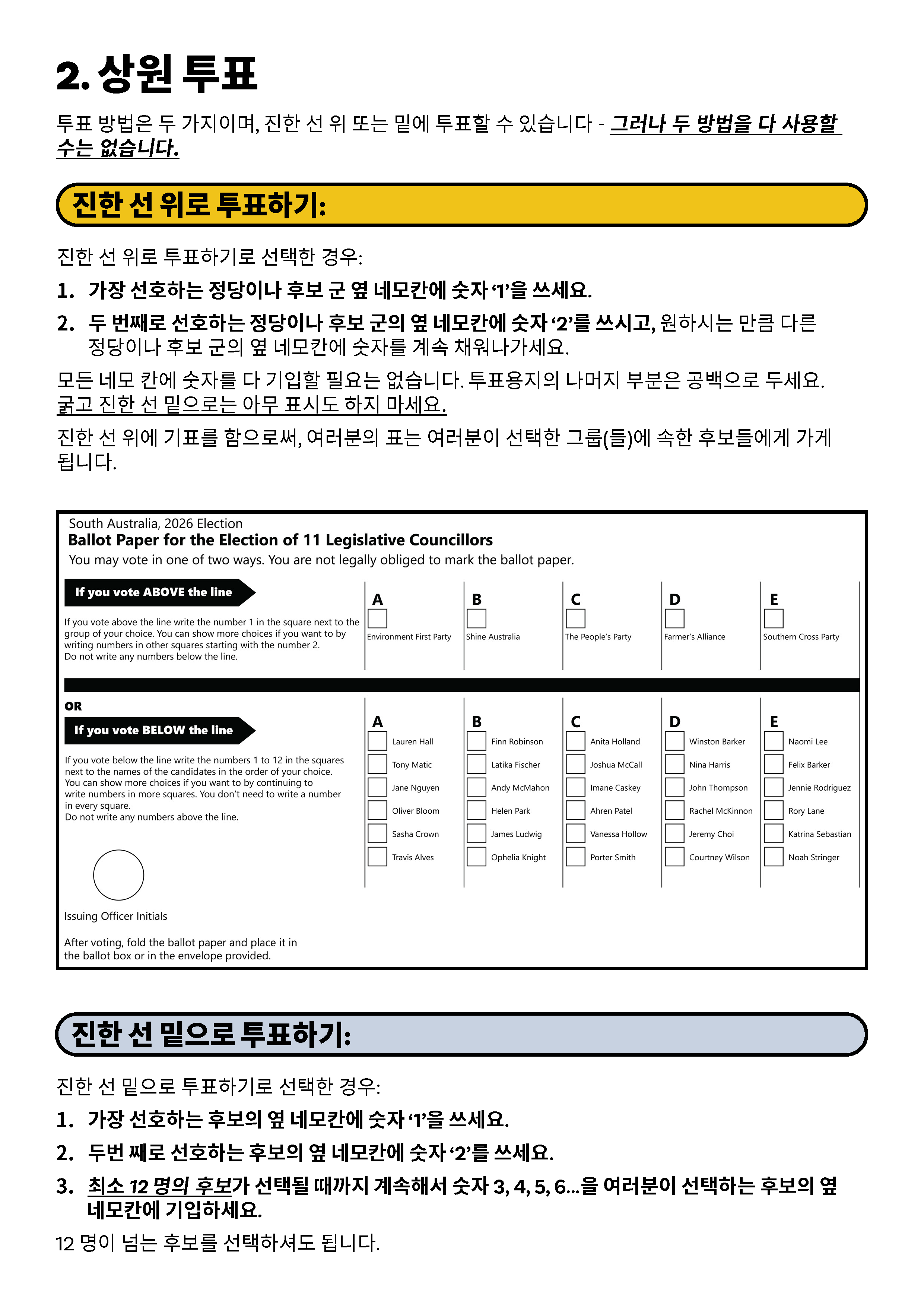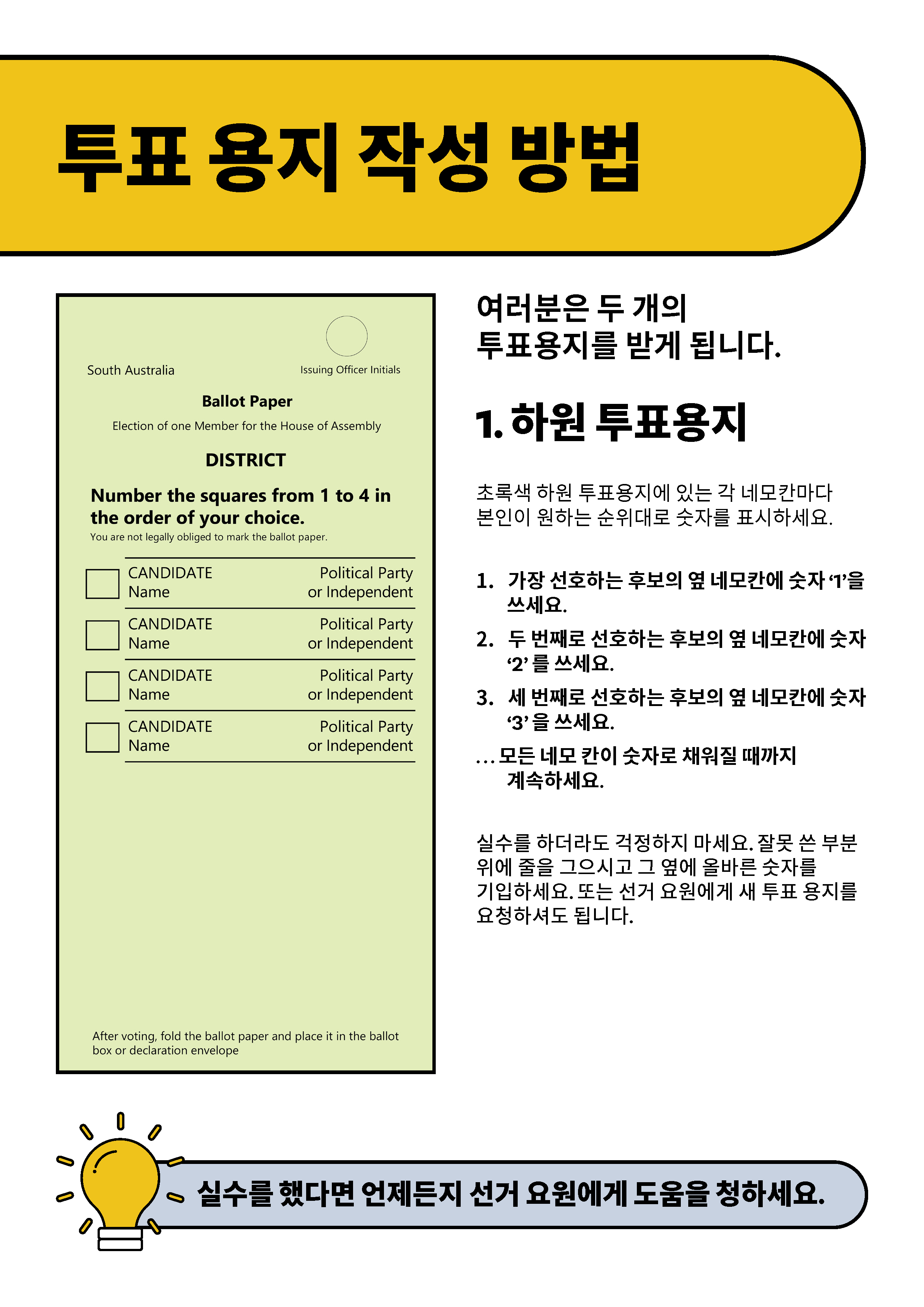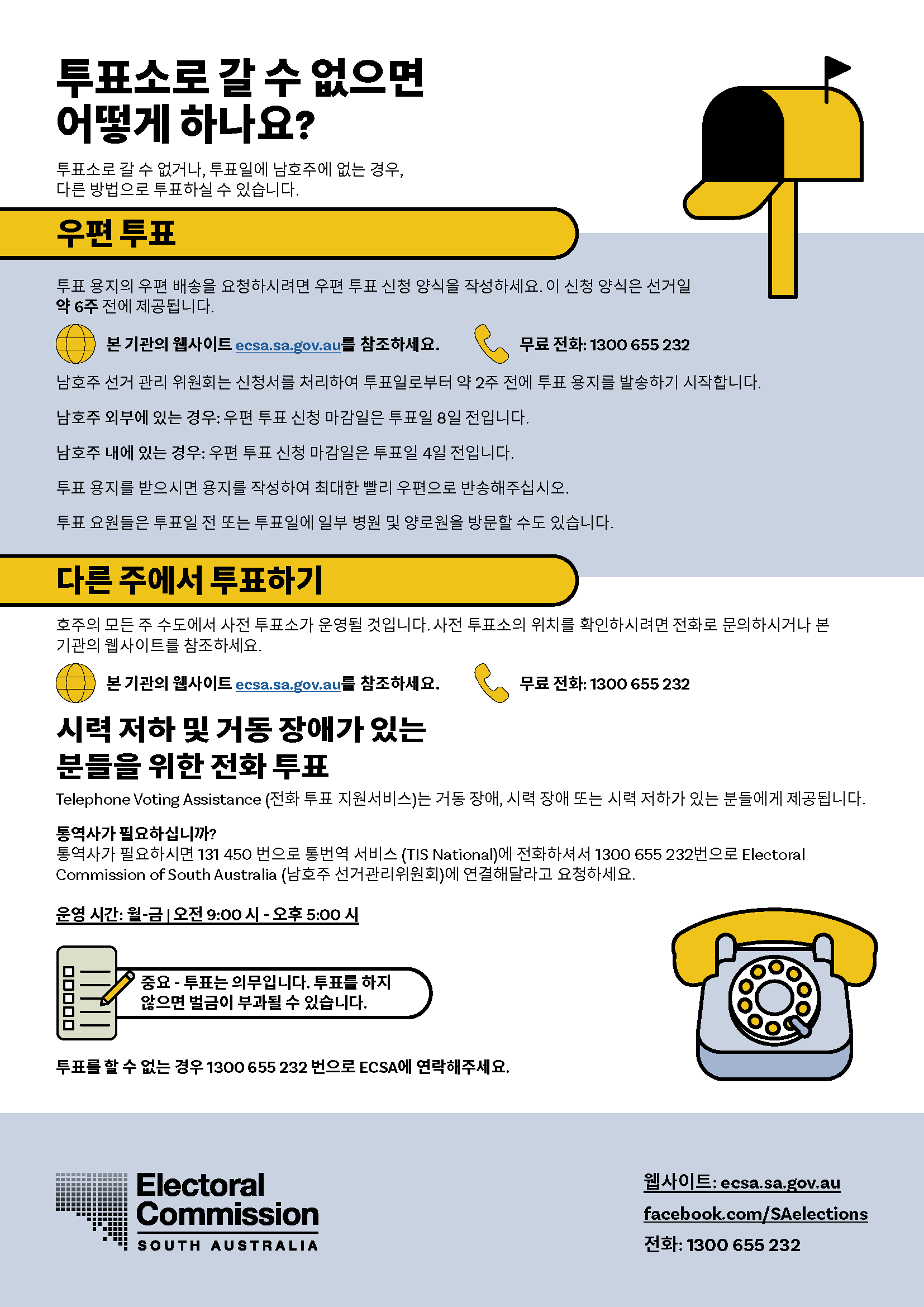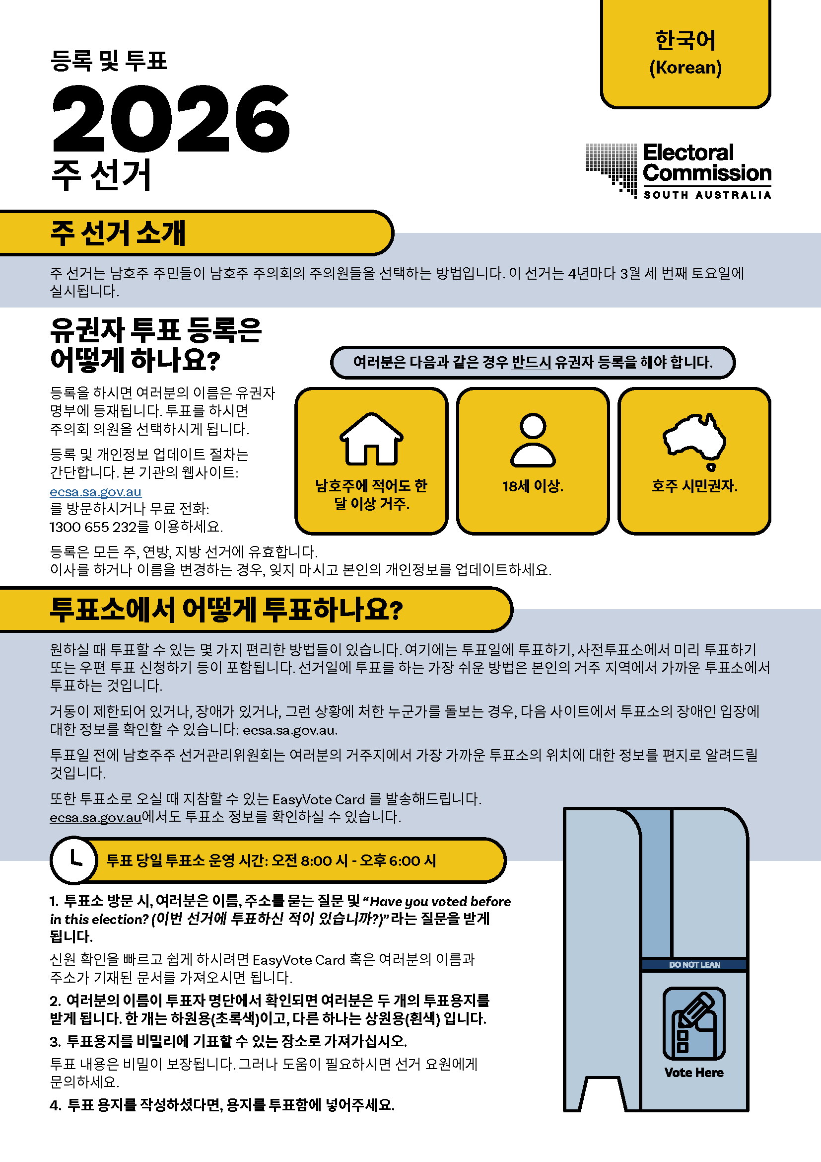 통역사가 필요하시면 13 14 50번으로 통번역 서비스 (TIS National)에 전화하셔서1300 655 232번으로 남호주주 선거관리 위원회(Electoral Commission of South Australia)에 연결해달라고 요청하십시오. 본 기관의 근무시간은 월-금 오전 9시부터 오후 5시까지입니다.