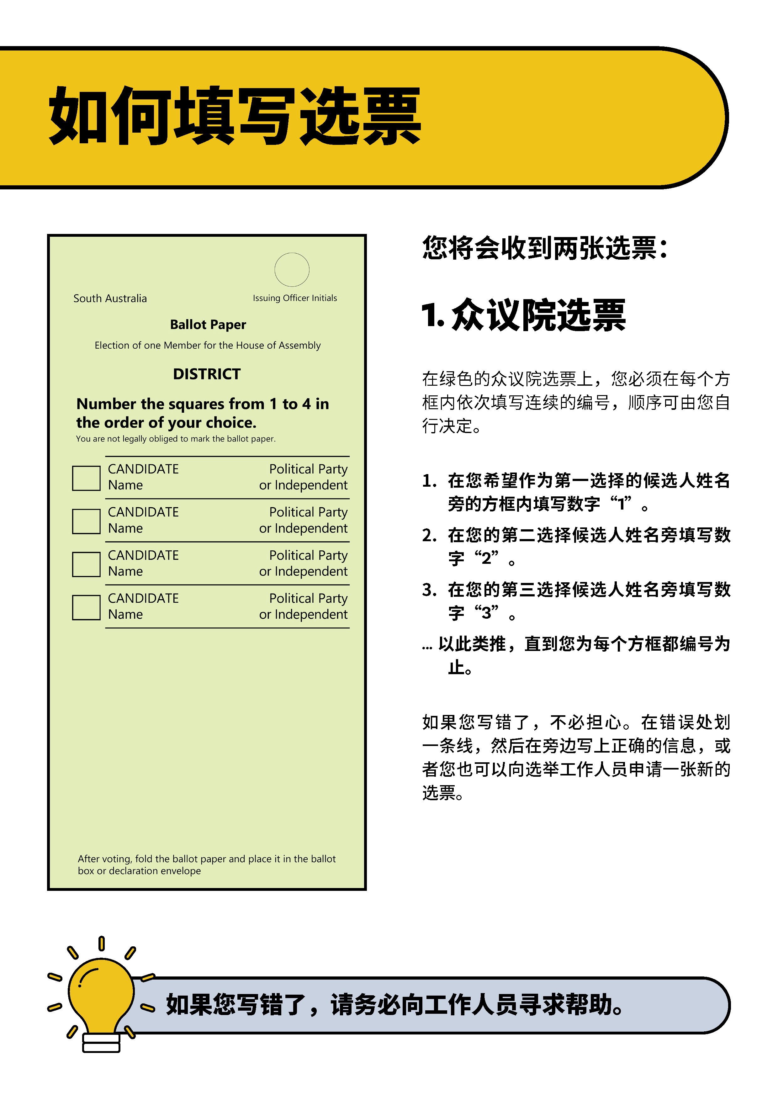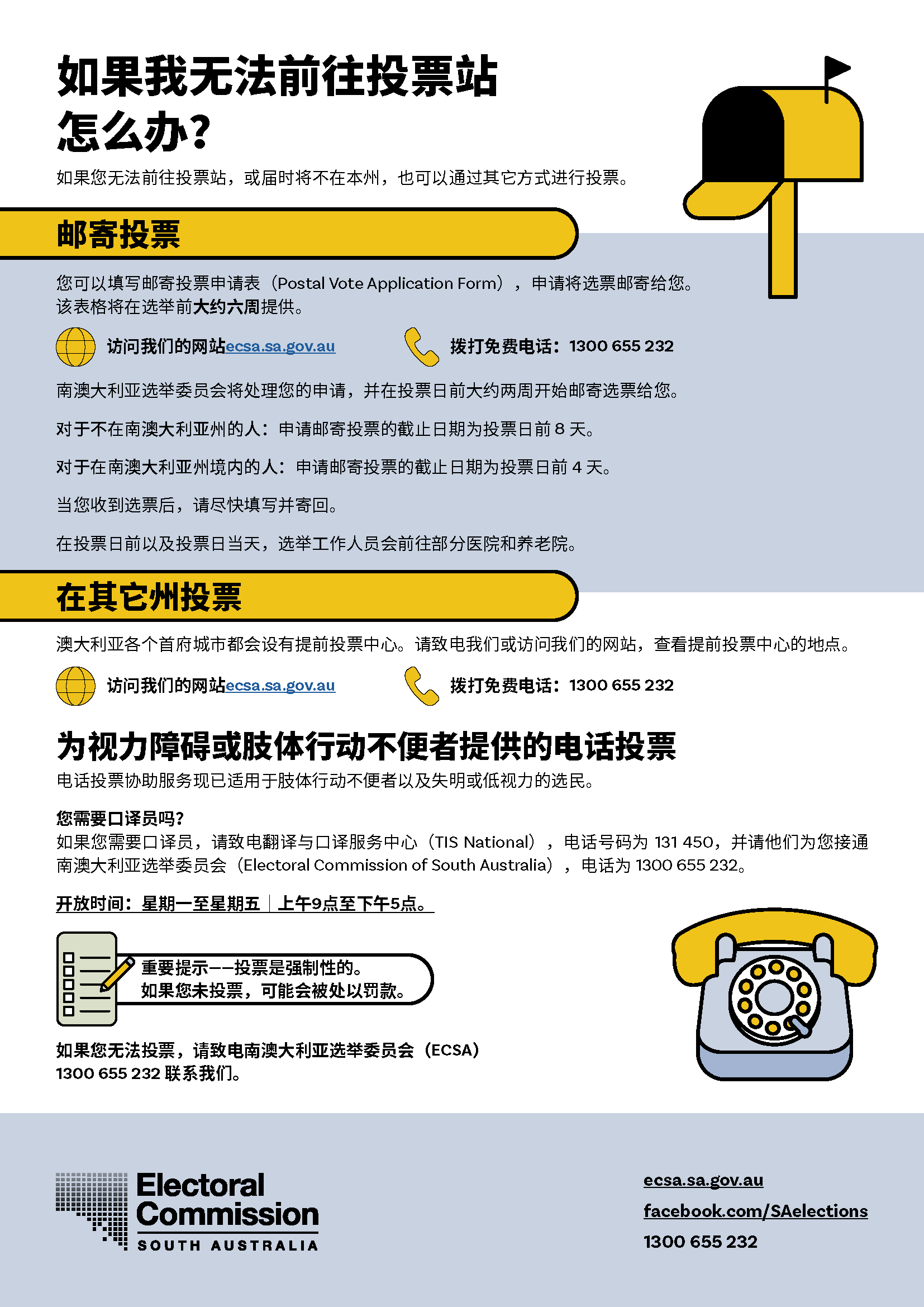 如果你需要口译员,请拨笔译及口译服务处(TIS National)的电话 13 14 50并请他们转接南澳选举委员会的电话1300 655 232。我们的办公时间是星期一至星期五上午9点到下午5点(中部标准时间)。