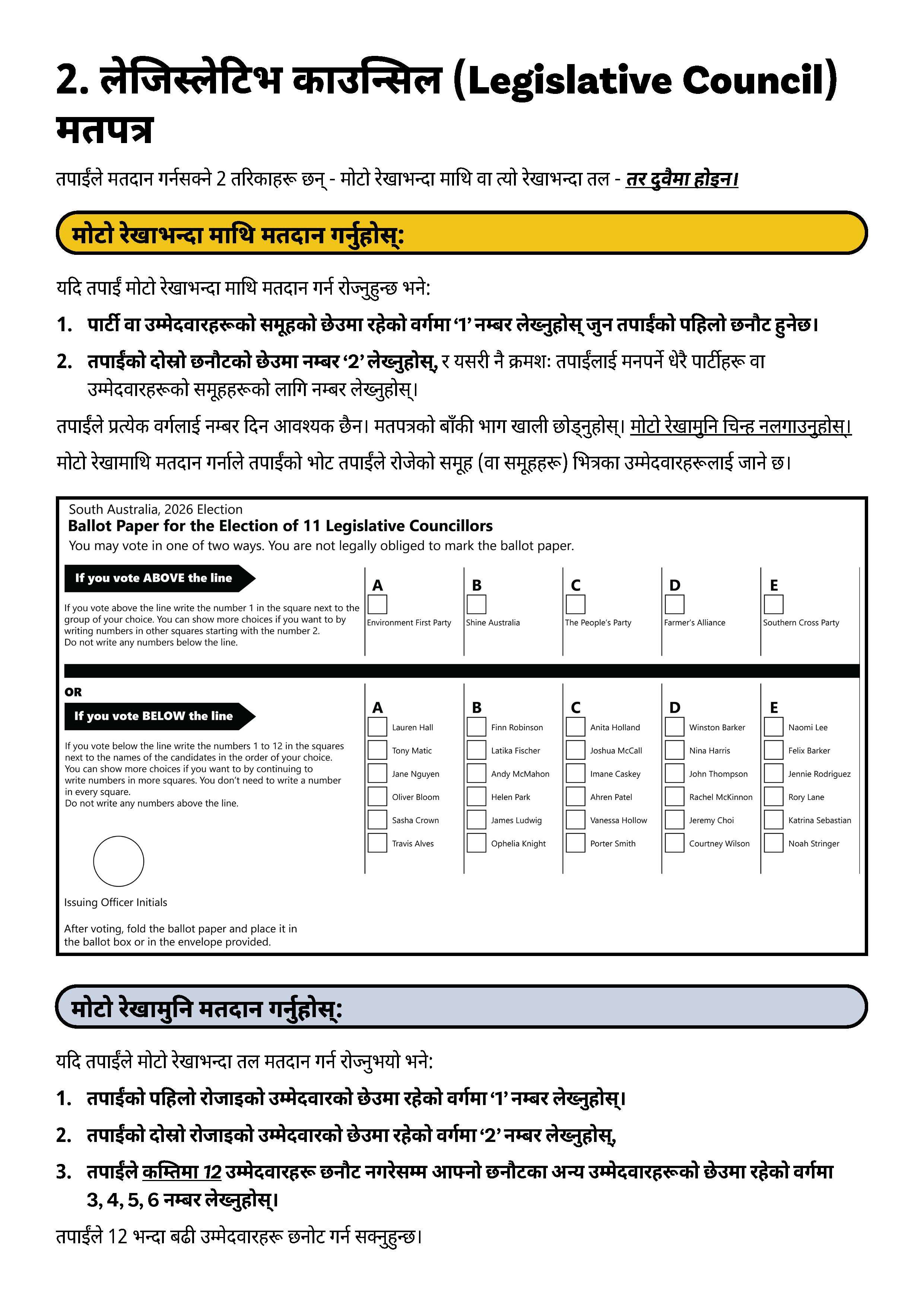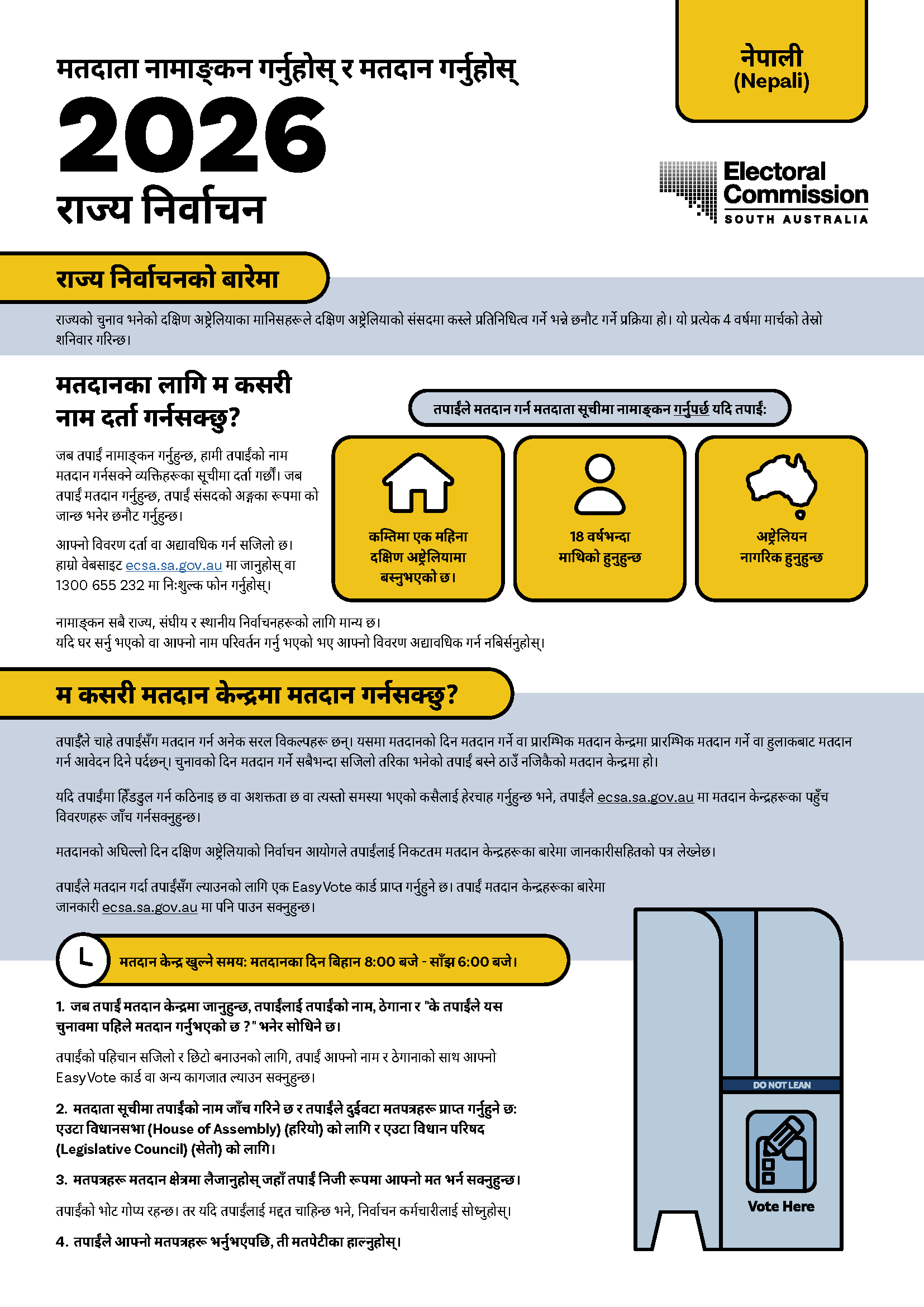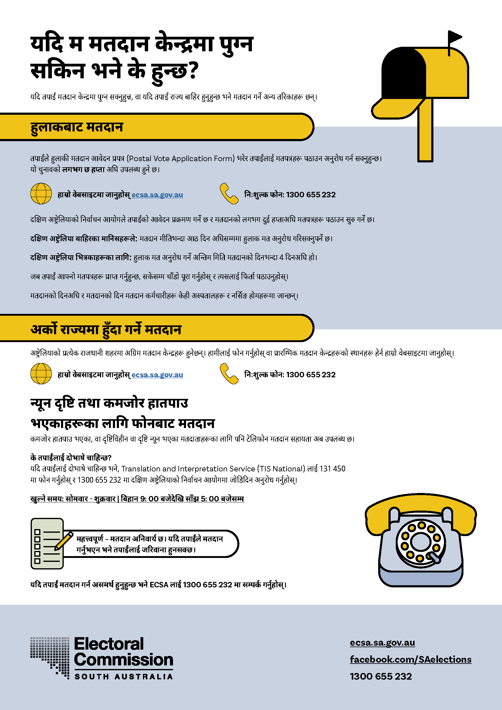 यदि तपाईलाई दोभाषे चाहिन्छ भने, कृपया अनुवाद तथा दोभाषे सेवा (TIS National) लाई  13 14 50 मा फोन गर्नुहोस् र उनीहरूलाई निर्वाचन आयोग साउथ अष्ट्रेलिया (Electoral Commission SA) लाई  1300 655 232 मा फोन लगाई दिन अनुरोध गर्नुहोस्। हाम्रो कार्यलय समय बिहान 9 बजेदेखि बेलुका 5 बजेसम्म  (सेन्ट्रल स्ट्याण्डर्ड टाइम) (CST) सोमबारदेखि शुक्रबारसम्म हो।